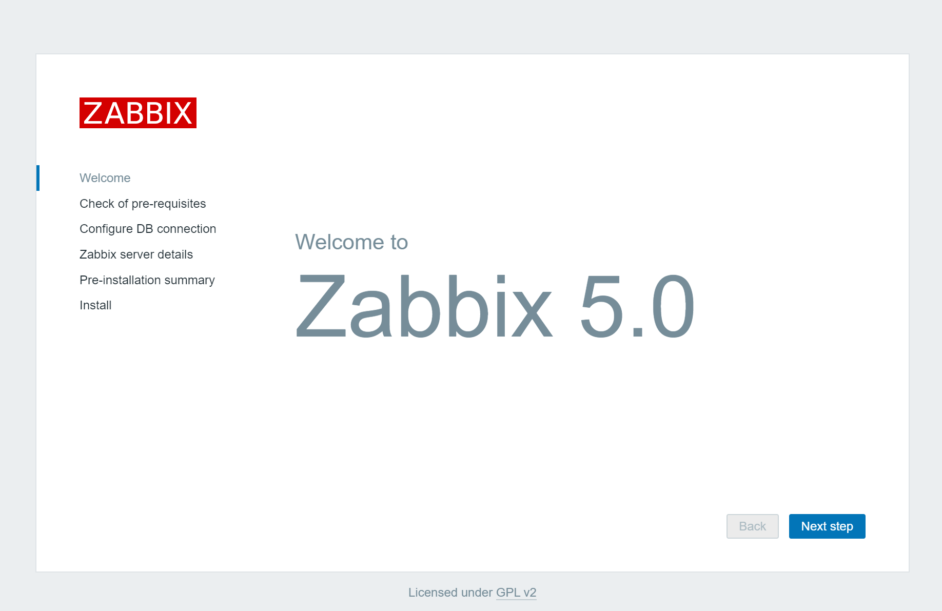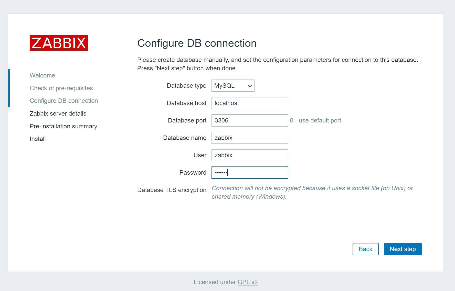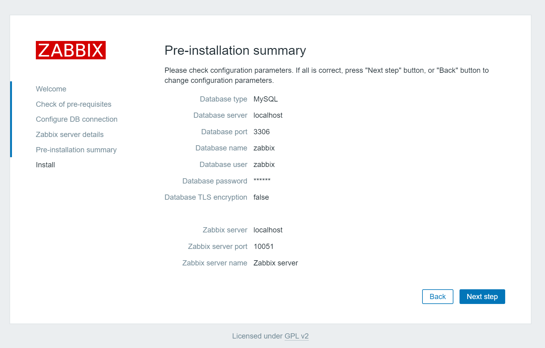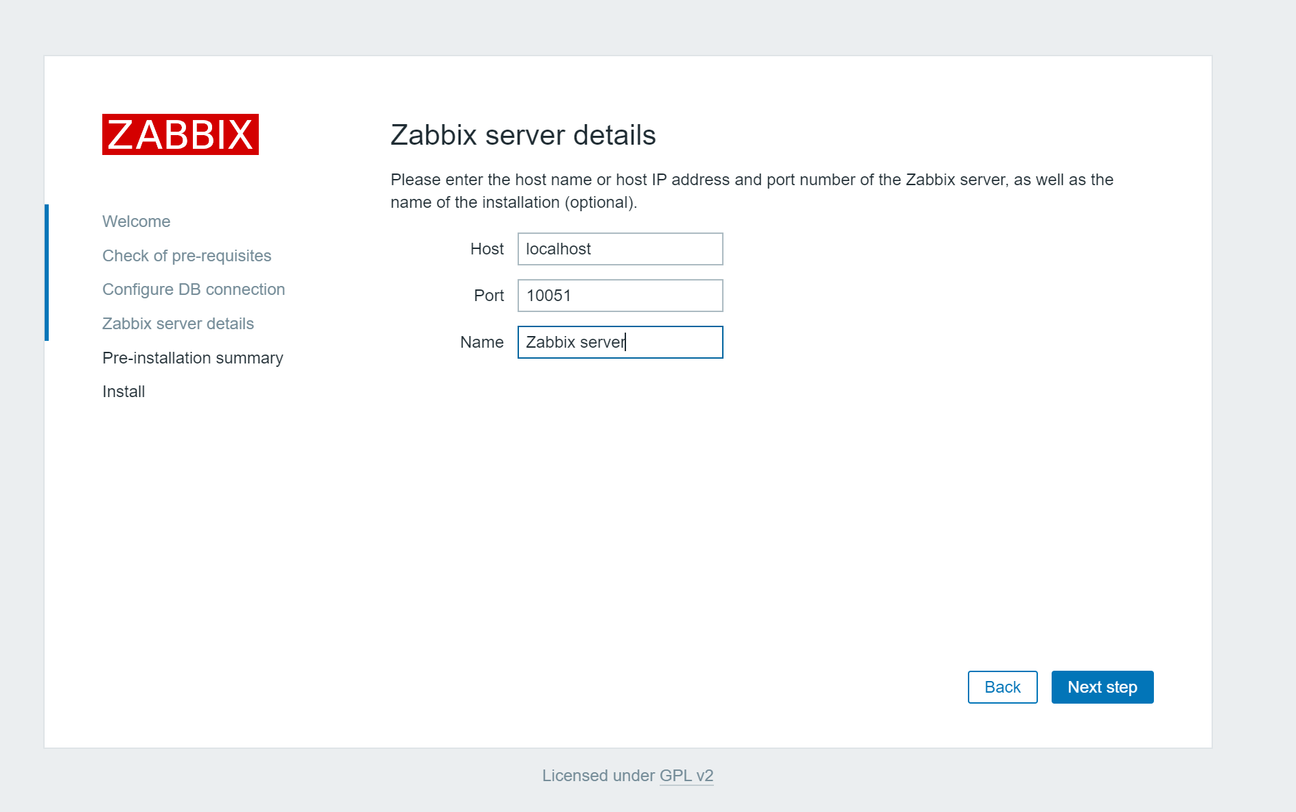Zabbix server配置默认无需修改,直接点击Next step进行下一步