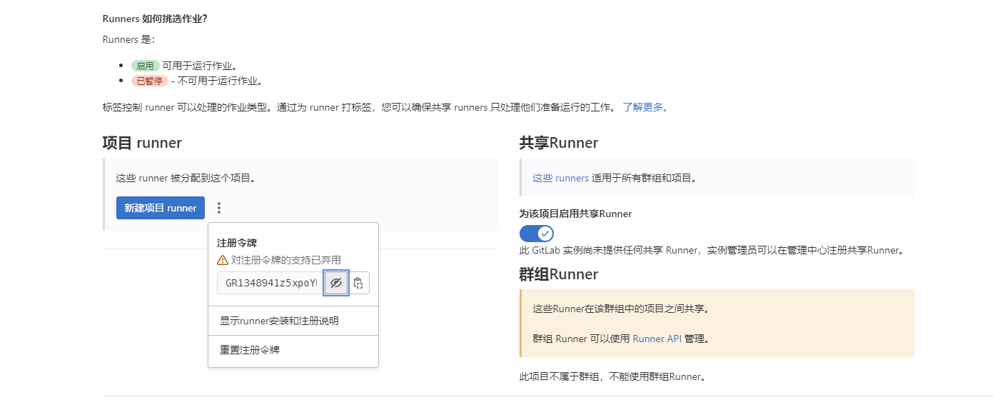 特别注意:这里的token就是gitlab runner上截图的地方,base64只有在k8s环境上需要,登录Gitlab,Runner右边栏token信息 如下图